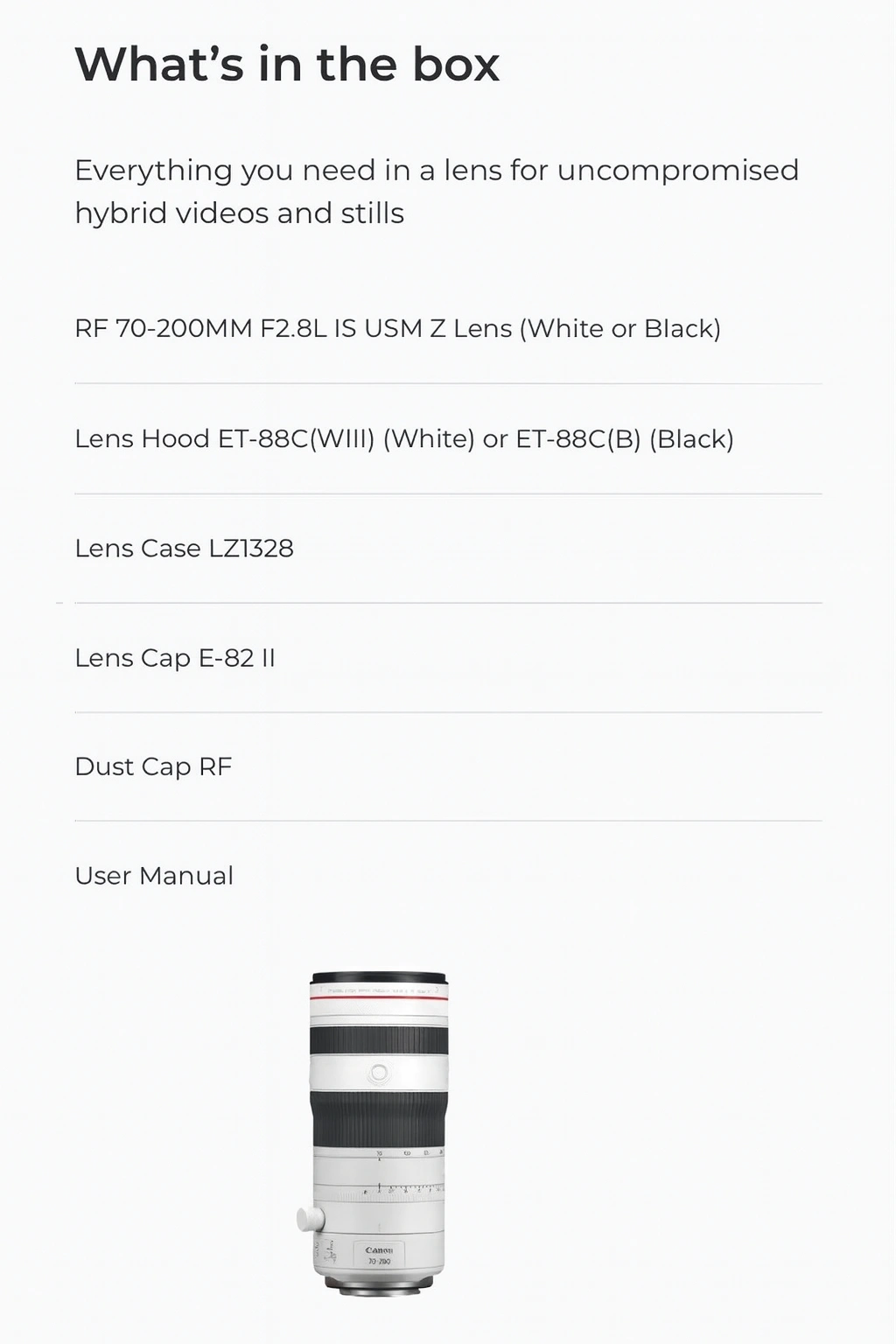 - متوافقة مع RF Extenders 1.4× و2× للوصول إلى مدى 280 مم أو 400 مم مع الحفاظ على التركيز التلقائي والتثبيت