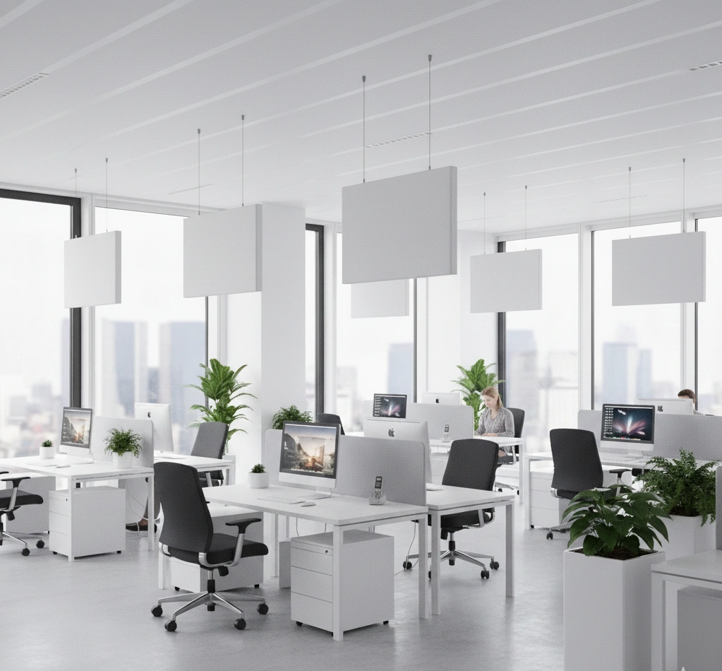these panels absorb sound from both sides, making them highly effective in environments where wall or ceiling treatments are not enough.